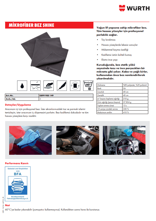 İnce ve sıkı fiber yapısı, boyalı yüzeylerin hologramsız şekilde parlatılmasını sağlar. Son derece ince dokuma sayesinde boya çizilmez. Ek olarak bez, pencere temizliği, arabalarda kullanım, kokpit bakımı ve toz alma için son derece uygundur.