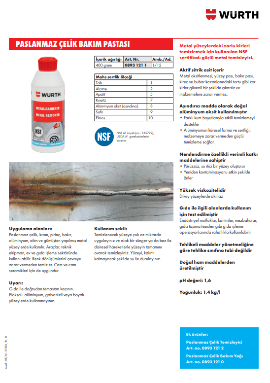 Metal oksitlenmesi, yüzey pası, bakır pası, kireç ve buhar kazanlarındaki leke gibi zor kirler güvenli bir şekilde çıkarılır ve malzemeler ile uyumludur.