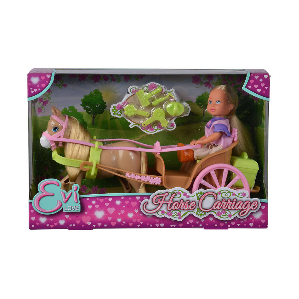 Simba’dan şimdi de Evi Love. Kızlar bebeklerini en son moda trendlerine göre şekillendirebilir ve giydirebilir. Küçük Evi Love romantik atlı arabasıyla bir yolculuğa çıkıyor. Araba kahverengi atı tarafından çekilir ve Evi arabaya oturup dizginleri tutabilir. Araba 28 cm uzunluğundadır. Evi'nin koltuğunun arkasında küçük nesnelerin saklanabileceği gizli bir bölme vardır. Set ayrıca çok sayıda at aksesuarının saklanabileceği küçük yeşil bir kutu içerir. Evi Love 12 cm boyundadır. 3 yaş ve üzeri çocuklar için uygundur.