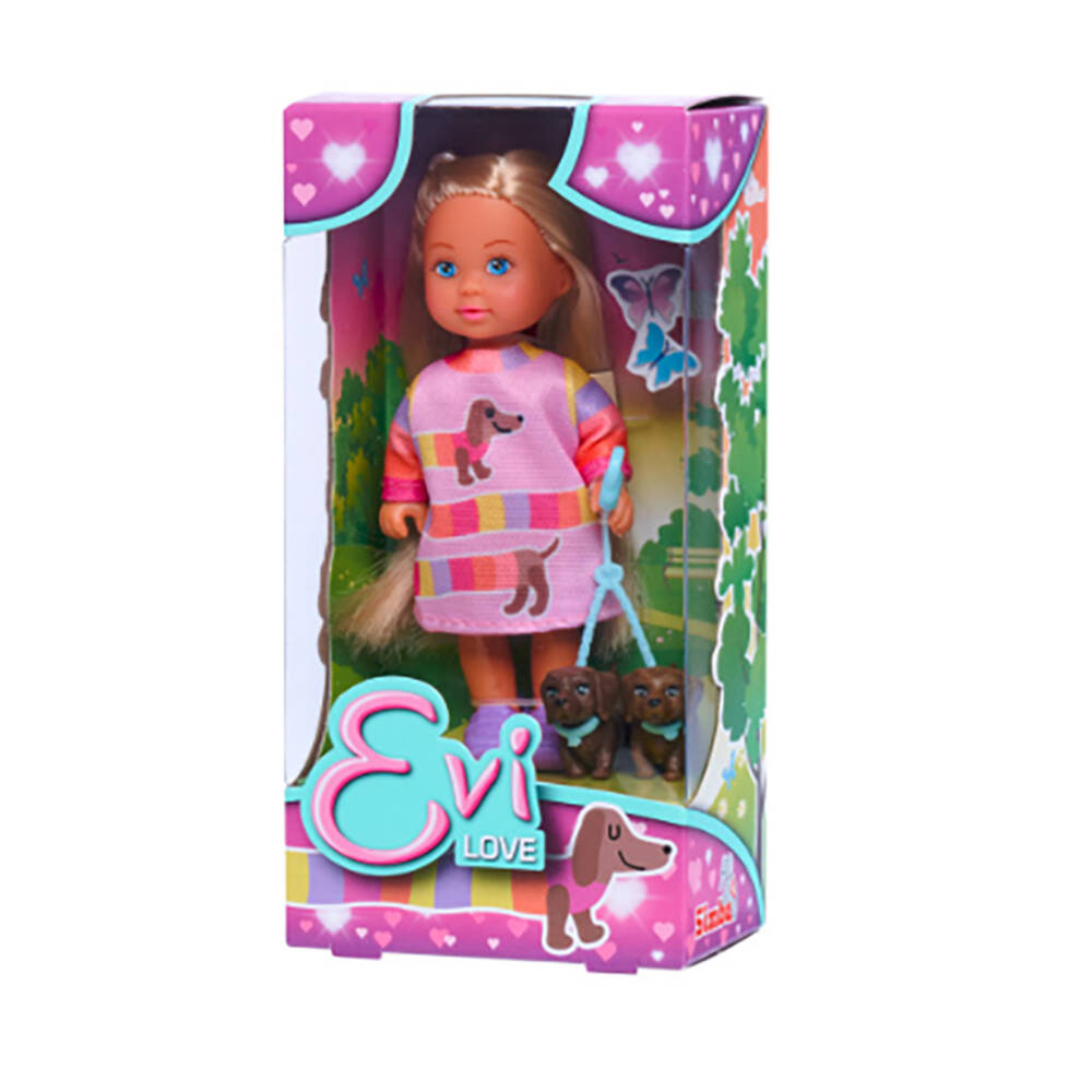 Simba’dan şimdi de Steffi Love’ın kız kardeşi Evi Love. Evi love her zaman sevimli ve eğlenceli görünümüyle bizlere oyun vakitlerimizde eşlik ediyor. Evi Love bu sefer hoş bir yürüyüş kıyafeti giyip, güzel bir tatil gününde 2 evcil hayvanı ile birlikte yürüyüşe çıkıyor. Set içerisine 2 adet köpek figürü dahildir. Bebek boyu 12 cm’dir. 3 yaşın altındaki çocuklar için uygun değildir.